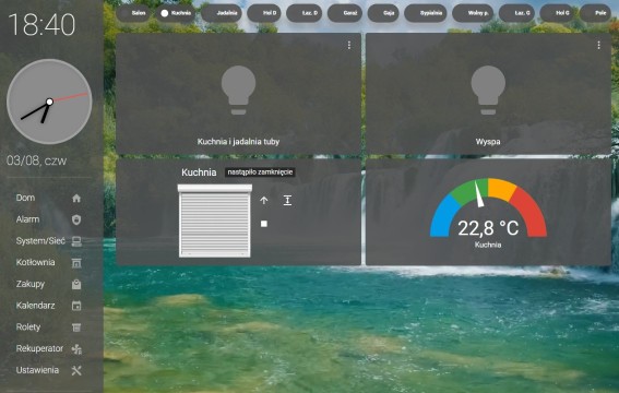 Główne menu systemu automatyki domowej (regulacja temperatur, podgląd z kamery, otwieranie bramy, pogoda)